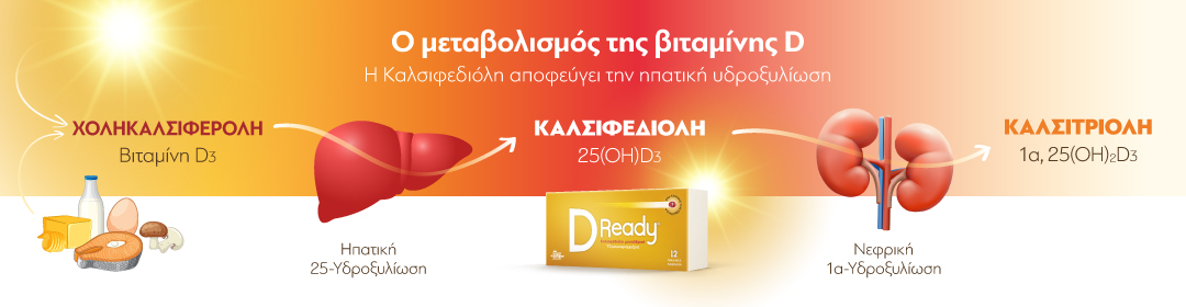 Το D Ready® είναι MH ΣΥΝΤΑΓΟΓΡΑΦΟΥΜΕΝΟ ΦΑΡΜΑΚΟ για τη ρύθμιση των επιπέδων της βιταμίνης D. Δραστική ουσία του D Ready® είναι η Καλσιφεδιόλη. Διατίθεται σε συσκευασία με 12 μαλακά καψάκια και κάθε μαλακό καψάκιο περιέχει 75 μικρογραμμάρια Καλσιφεδιόλης μονοϋδρικής.1