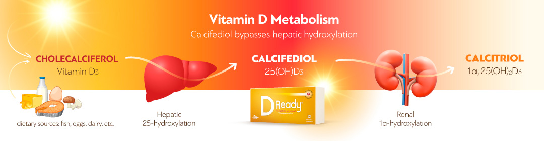 Non-prescription medicinal product for the prevention and treatment of vitamin D deficiency and as an adjunct in the specific treatment of osteoporosis. Contraindications: Do not administer in individuals under 18 years of age, in cases of hypersensitivity to the active substance or to any of the excipients, hypercalcemia, hypercalciuria, calcium lithiasis, hypervitaminosis D, during pregnancy, or breastfeeding. D Ready® must not be administered on a daily basis.
